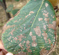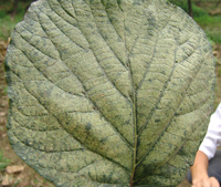 4月中旬,病原菌由葉背面開始侵染,為侵染的初期。5-6月份,氣溫20-24℃,更有利于侵染,此時期是侵染高峰期。7-8月為發(fā)病高峰期(此時期高溫高濕)葉部癥狀明顯,開始是小病斑,后逐步擴(kuò)大,葉片后期干枯,大量落葉。到8月下旬開始大量落果。