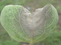 該病害不常發(fā)生。20~26℃的持續(xù)偏低溫,連陰雨天氣發(fā)病,汁液傳播。主要是通過刺吸式口器的蟲子進(jìn)行傳播,如葉蟬、蚧殼蟲。