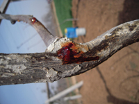 可在發(fā)病獼猴桃植株上發(fā)現(xiàn)病斑,病斑皮層隆起,組織變軟呈水漬狀,先為淡黃色,以后變?yōu)榧t褐色,病斑處出現(xiàn)小孔,流出白色液體,不久轉(zhuǎn)成鐵銹紅色,影響枝蔓營養(yǎng)輸導(dǎo),使枝蔓上部的枝、葉、果生長不良。