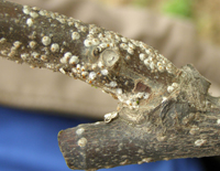 屬于同翅目,體外有蠟質(zhì)介殼。卵通常埋在蠟絲塊中、雌體下或雌蟲分泌的介殼下。 介殼蟲繁殖能力強(qiáng),一年發(fā)生多代。卵孵化為若蟲,經(jīng)過短時間爬行,營固定生活,即形成介殼。介殼蟲抗藥能力強(qiáng),一般藥劑難以進(jìn)入體內(nèi),防治比較困難。