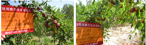 2014年7月,新疆吐魯番伊拉湖鮑秀,在灰棗幼果期噴施國光植生源1000倍+國光優(yōu)豐1500倍,使用1次,成熟期觀察,使用保果膨果套餐灰棗,保果效果好,棗果膨大明顯,且不影響上色成熟,畸形果率少;對產(chǎn)量進(jìn)行測定,使用保果套餐灰棗增產(chǎn)12%。