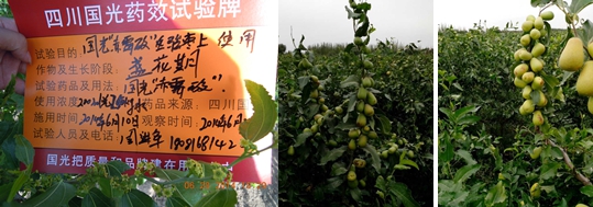 2014年6月,新疆阿克蘇農(nóng)一師兵團(tuán)棉麻站,陸地灰棗園,在灰棗盛花期使用國(guó)光3%赤霉酸2000倍+國(guó)光硼2000倍+國(guó)光優(yōu)豐2000倍,全株噴施2次(間隔7天使用一次)。用藥后棗果脫盤(pán)率高,脫盤(pán)快,平均棗吊坐果率15個(gè)。