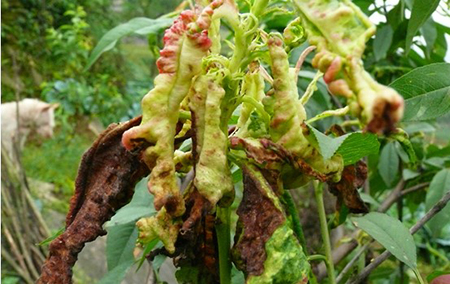 桃樹縮葉病主要為害葉片,嚴(yán)重時(shí)也可以為害新梢和幼果。