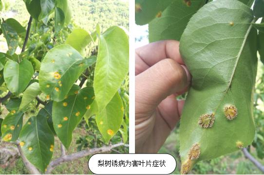 在病斑出現(xiàn)橘黃色黏液時噴施梨膠銹菌重寄生菌等,可以寄生消解梨銹病的病菌,從而逐年減輕銹病的危害。