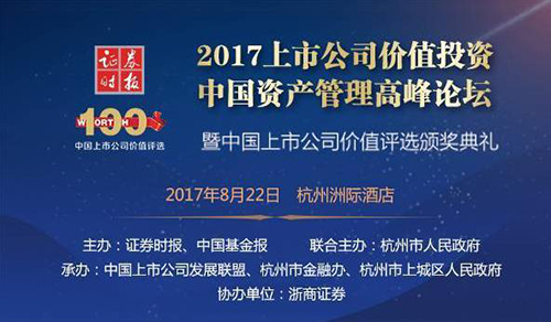 2017年8月22日,由證券時報社、中國基金報社主辦,杭州市人民政府聯(lián)合主辦,中國上市公司發(fā)展聯(lián)盟、杭州市金融辦、杭州市上城區(qū)人民政府承辦的“2017上市公司價值投資·中國資產(chǎn)管理高峰論壇暨中國上市公司價值評選頒獎典禮”在杭州市洲際酒店舉行。