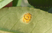 主要為害成熟或近成熟葉片。葉片染病葉背面現(xiàn)黃色、裸露的夏孢子堆,大小0.2—0.4mm,圓形至橢圓形,包被破裂后變?yōu)槌赛S色,后又褪為淺黃色,在與夏孢子堆對應(yīng)的葉正面現(xiàn)紅褐色斑塊,秋后又形成冬孢子堆,圓形,大小0.2—0.7mm,橙黃色至暗黃色,嚴(yán)重時(shí)孢子堆擴(kuò)展至全葉。