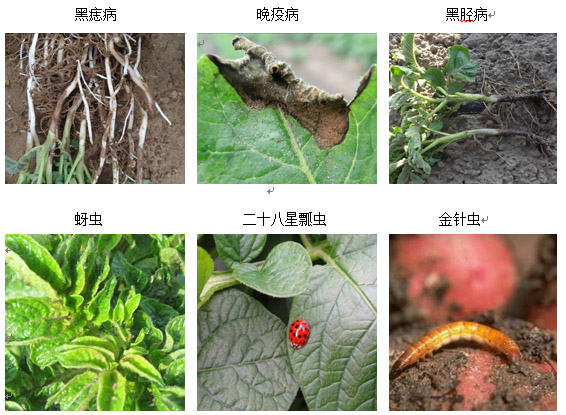 以預防為主,及時防治病蟲害。苗期——開花期的主要病害有黑痣病、早疫病、晚疫病、黑脛病、環(huán)腐病等。黑痣病近兩年在馬鈴薯上發(fā)生比較多,特別是在苗期地溫較低、濕度大的情況下易發(fā)生,嚴重影響馬鈴薯幼苗的生長。對于黑痣病可以在苗期(苗高10-20cm)使用30%噁霉靈水劑(如國光重茬寶)進行噴灌或滴灌,能有效控制黑痣病的發(fā)生。另外,如果連續(xù)一周以上的陰雨天氣,就容易發(fā)生晚疫病,對晚疫病要以預防為主,在出苗率達95%后用代森錳鋅、甲霜靈錳鋅進行預防,發(fā)病初期開始噴灑甲霜靈、霜脲氰、三乙膦酸鋁等藥劑隔7~10天1次,連續(xù)防治2~3次,也可以使用國光三治(50%錳鋅·氟嗎啉)80-107g/畝噴霧進行防治。對于早疫病可以使用百菌清、代森錳鋅等藥劑進行預防,在發(fā)病初期可以使用甲霜靈錳鋅、霜脲錳鋅、苯醚甲環(huán)唑等藥劑進行防治。對于黑脛病、環(huán)腐病等細菌性病害可以使用農用鏈霉素、銅制劑等藥劑進行預防,若發(fā)現(xiàn)病株及時清除。此期馬鈴薯的主要害蟲有蚜蟲、28星瓢蟲、薊馬、跳甲、金針蟲、蠐螬、小地老虎。對于蚜蟲、薊馬可以使用吡蟲啉、啶蟲瞇等藥劑進行防治,對于瓢蟲、跳甲、地下害蟲等可以使用氯氰菊酯加上甲維鹽防治。