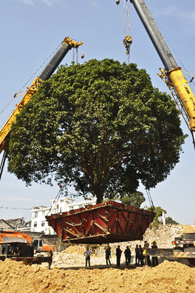 20名作業(yè)人員,連續(xù)一周的緊張工作,40余萬元搬家費用。2014年10月23日上午12時10分,在兩臺大型起重機(jī)巨臂的牽引下,總重達(dá)62噸的“桂花王”連同底部的箱梁緩緩落入預(yù)定的坑穴,岳西縣城居民廣泛關(guān)注的“桂花王”順利移動60余米,成功入住新家。