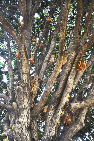 從10月15日開始開挖,到今天成功搬家,再到下一步的“生根發(fā)芽”,如何確保這棵桂花王順利適應(yīng)新環(huán)境?來自四川農(nóng)大的碩士王天龍介紹,從15日開始,技術(shù)人員定期往樹葉上噴灑抑制蒸騰劑,以減少水分蒸發(fā)。同時使用營業(yè)液為枝干補(bǔ)充能量!澳壳拔覀兪褂玫臓I養(yǎng)液已經(jīng)超過300公斤,你看樹干上一袋袋,掛的都是營養(yǎng)液!蓖跆忑埿χf。