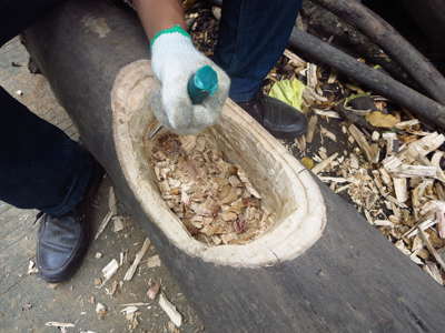 1、在樹(shù)干上用銼刀挖出一個(gè)樹(shù)洞,將樹(shù)洞邊緣及底部修整平(圖1)