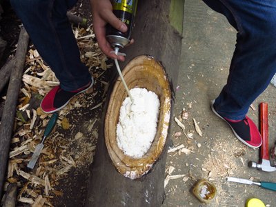 3、防腐材料涂抹好后,放置一段時(shí)間,晾干后,用聚氨酯泡沫填縫劑從底部開(kāi)始填充樹(shù)洞(圖3);