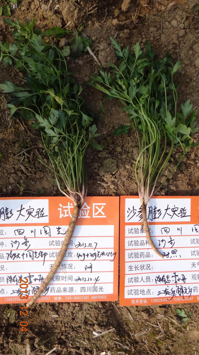 南沙參在12月開始地上部生長(zhǎng)基本穩(wěn)定,地下根莖干物質(zhì)開始積累,根莖迅速膨大,此時(shí)正是根莖迅速膨大和積累干物質(zhì)的關(guān)鍵時(shí)期。通過(guò)有效的化學(xué)調(diào)控可以顯著的提高南沙參的產(chǎn)量和干物質(zhì)的積累。2013年12月閬中市解元鄉(xiāng)南沙參種植戶何維超使用以下化學(xué)調(diào)控技術(shù),其南沙參增產(chǎn)率達(dá)到20%以上。具體使用方法如下: