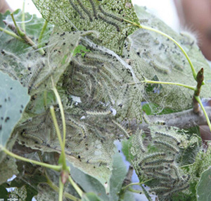 2、人工防治。在幼蟲3齡前發(fā)現(xiàn)網(wǎng)幕后人工剪除網(wǎng)幕,并集中處理。如幼蟲已分散,則在幼蟲下樹化蛹前采取樹干綁草的方法誘集下樹化蛹的幼蟲,定期定人集中處理。