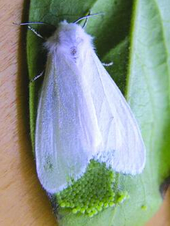 成蟲 白色中型蛾子,體長(zhǎng)13—15mm。復(fù)眼黑褐色,口器短而纖細(xì);胸部背面密布白色,多數(shù)個(gè)體腹部白色,無(wú)斑點(diǎn),少數(shù)個(gè)體腹部黃色,上有黑點(diǎn)。雄成蟲觸角黑色,櫛齒狀;翅展23-34mm,前翅散生黑褐色小斑點(diǎn)。雌成蟲觸角褐色,鋸齒狀;翅展33—44mm,前翅純白色,后翅通常為純白色。